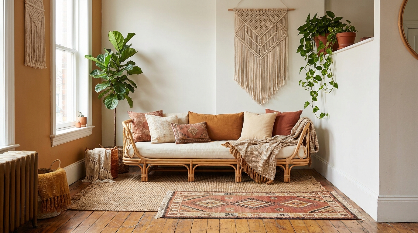A boho (short for bohemian) living room is defined by layered textiles, natural materials like rattan and jute, warm earthy tones, and an eclectic mix of vintage and handmade objects. It prioritizes warmth and visual texture over clean lines or matching sets. Think collected-over-time, not bought-all-at-once.